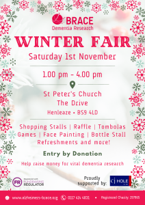 There’s face painting and games, a raffle with some great prizes; try your luck on the mystery tombola and bottle stall, buy your BRACE Christmas cards and enjoy a cuppa and home-made cake.