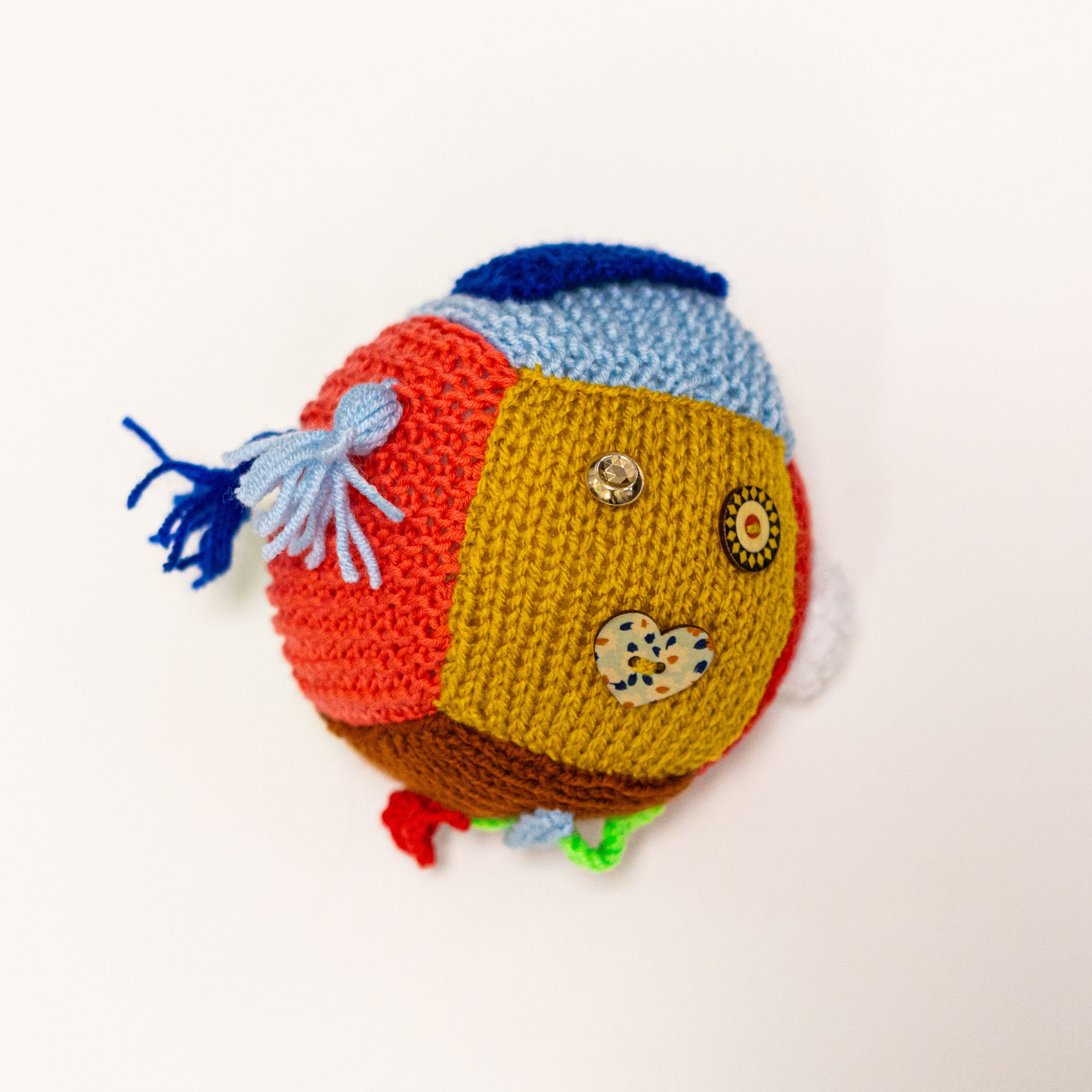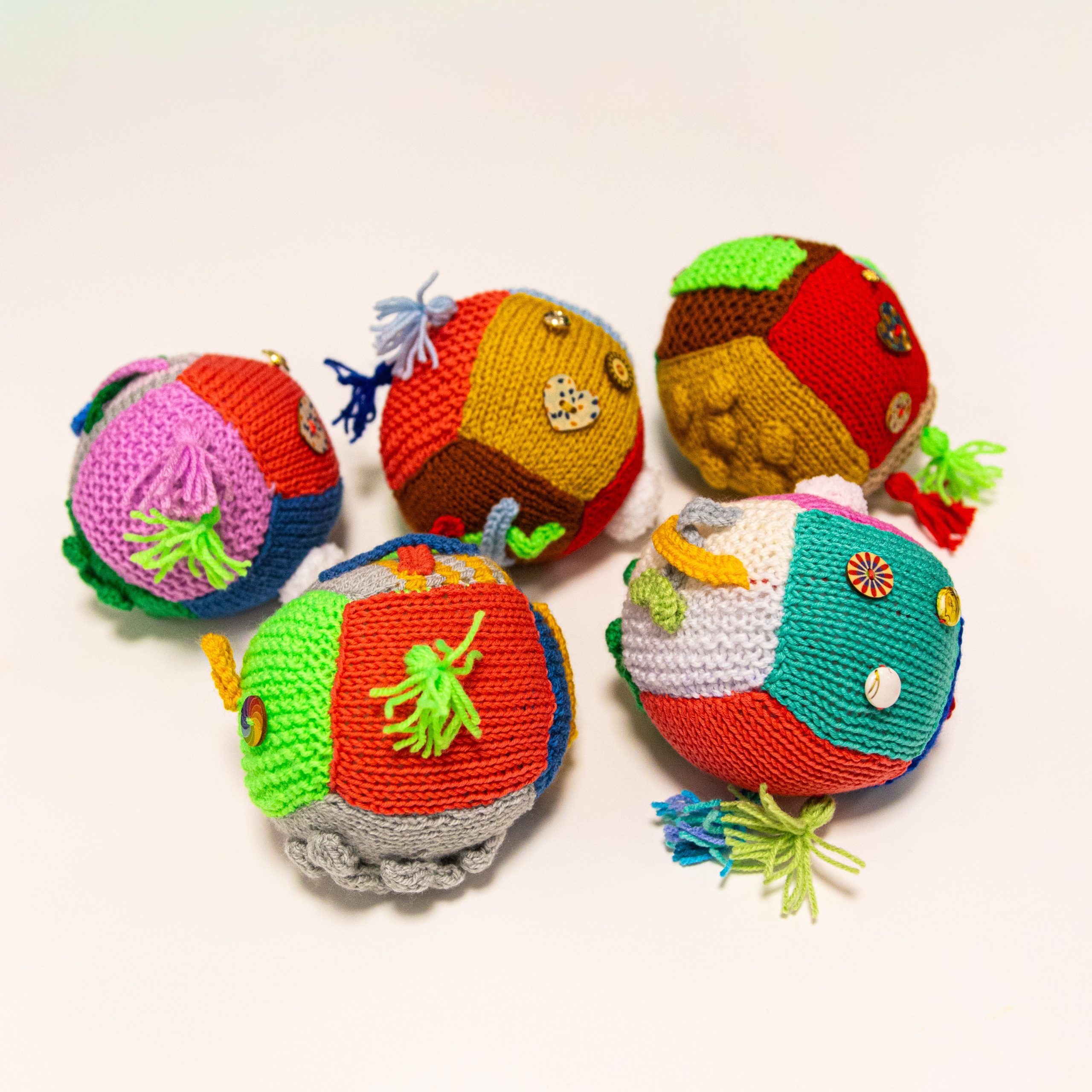 A Twiddleball is a knitted hand toy with various textures and objects to touch and twiddle. They are great for providing stimulation for people with dementia who have restless hands.